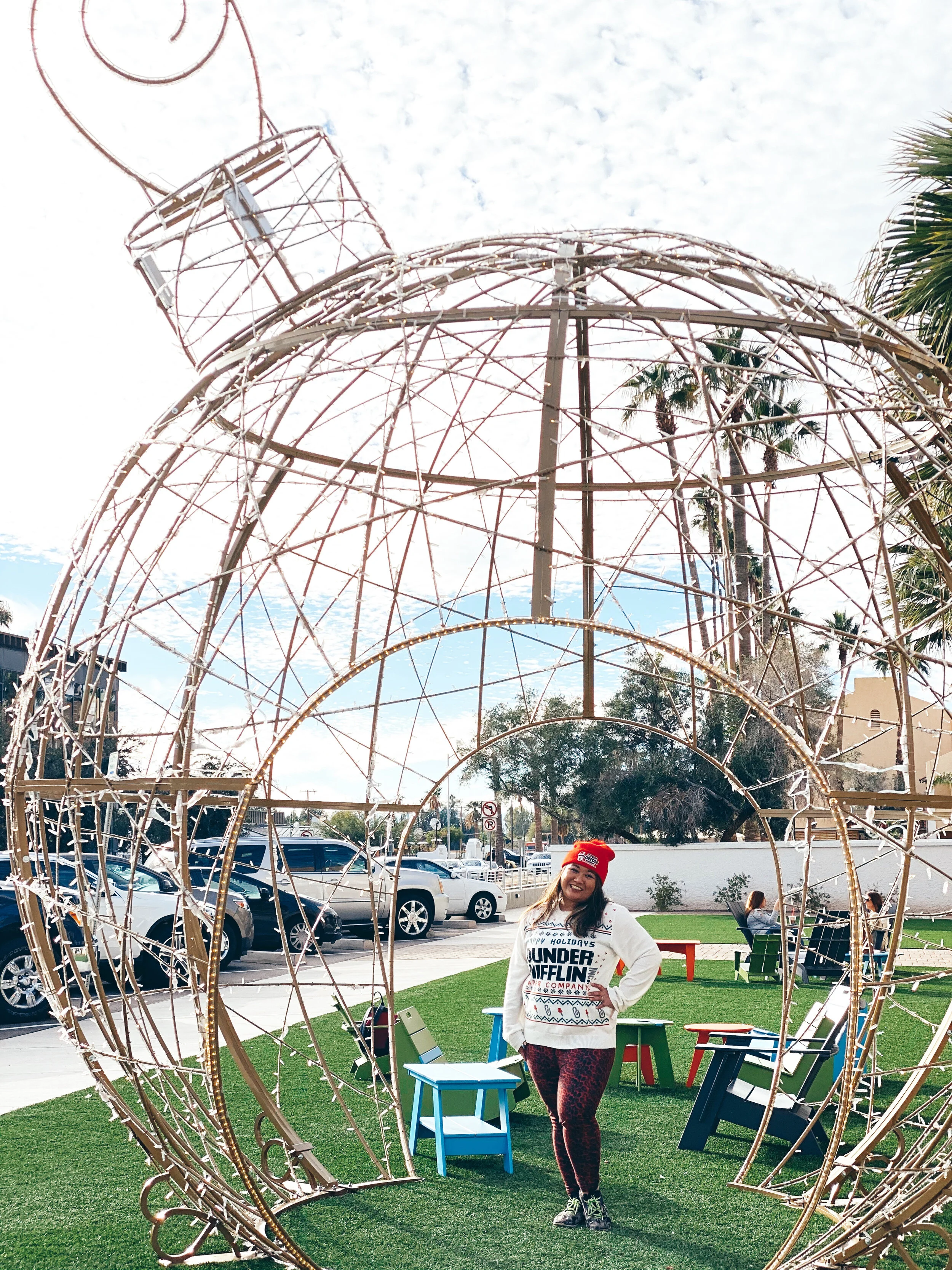 I met up with my girls Cassie (Explore With Cassie) and Jasmine (@JasmineVenturesAZ). We had a full itinerary thanks to our friends from Visit Chandler. Our first stop of the day was to do free yoga in the park. We went to A.J. Chandler Park in Downtown Chandler. With the sun shining, the yoga teacher, (@yogajeanee), led us through a relaxing flow that stretched my spine and opened up my hips. We then went over to check out the tumbleweed Christmas tree (artistic and impressive!) and the friendly vendors.