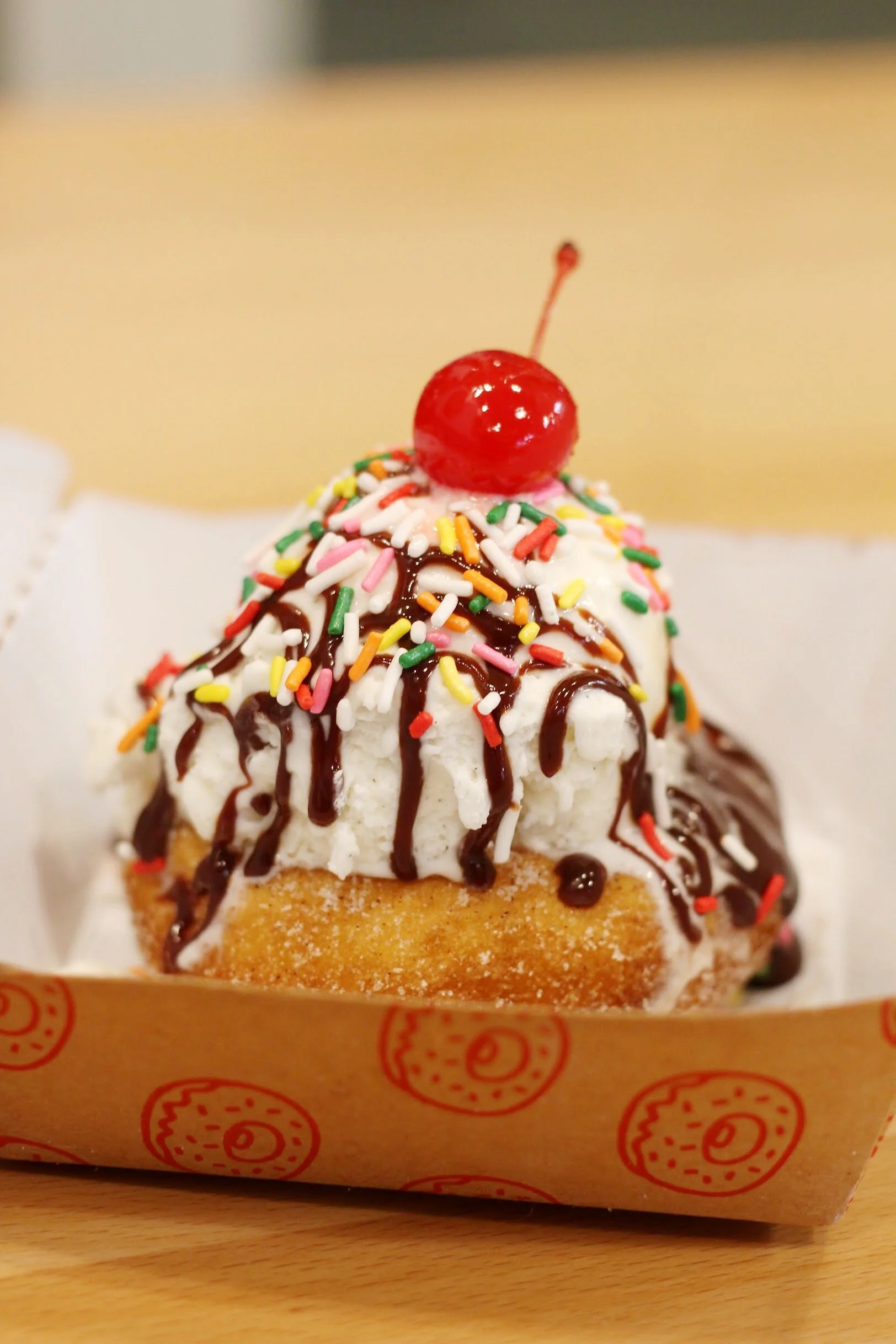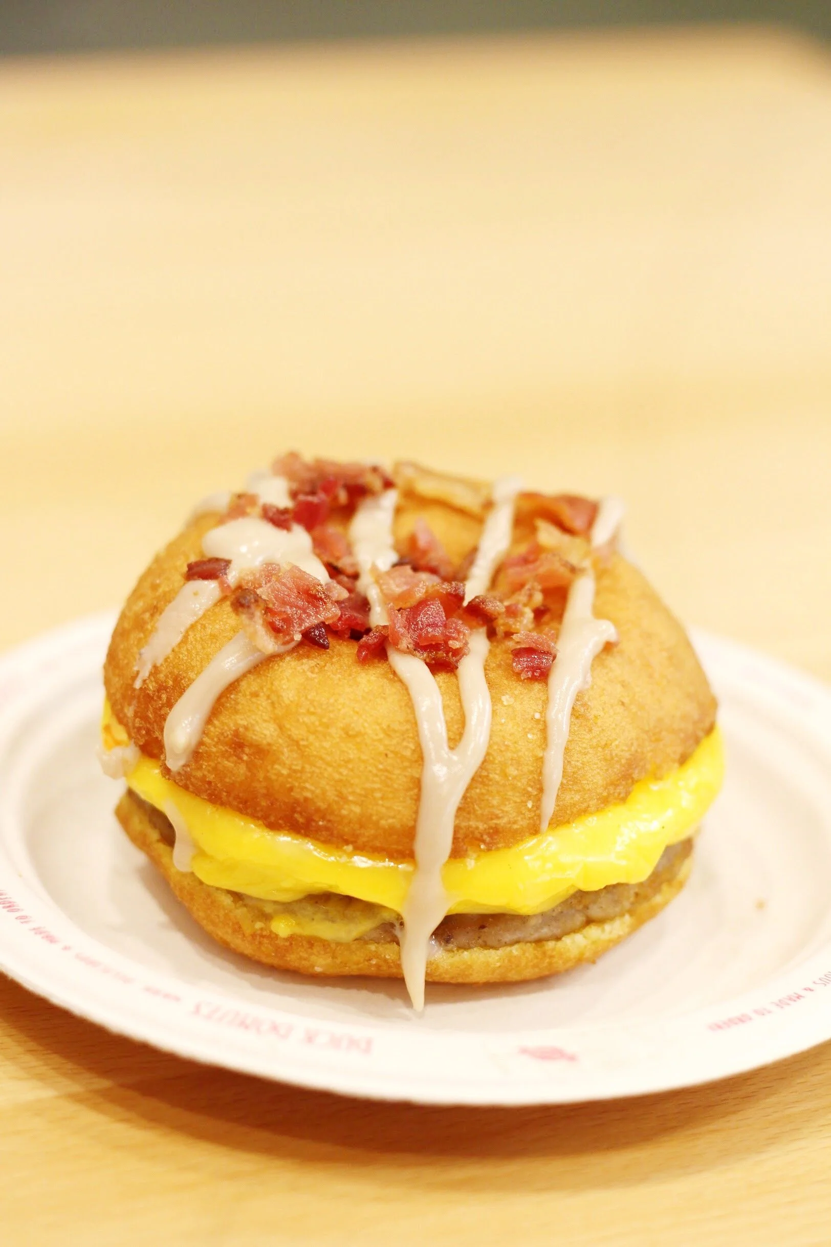 Next we tried their specialty items, their breakfast sandwich - Sausage, Egg, and Cheese with Chopped Bacon, and their Classic Donut Sundae: sprinkles and fudge on top of vanilla ice cream and a donut. I loved every bite of both of these creations!